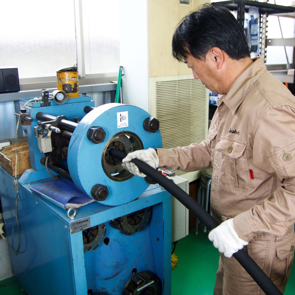 アラテックでは、これらの基準を厳密に守り、ホース・継手ともに安定した高い品質をもたらす国産部品を中心に使用し、より長い時間、より安定してお使いいただける油圧ホース製作にこだわっています。