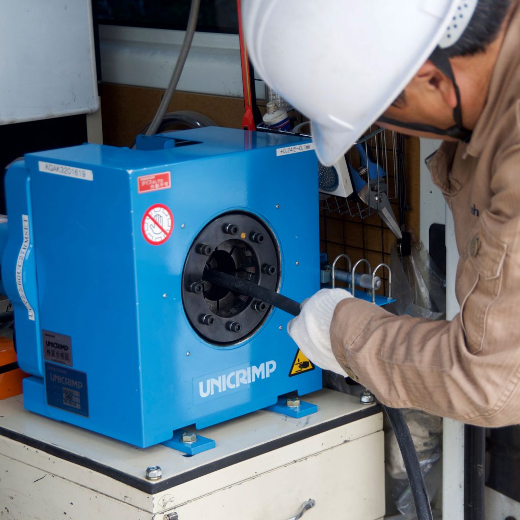 突然のホース破損の場合でも、栃木県内(及び近隣県)各地の現地に直接サービスカーで乗り付け、その場で対応。ダウンタイムを最小限に抑える取り組みは、お客様にも高い評価をいただいております。